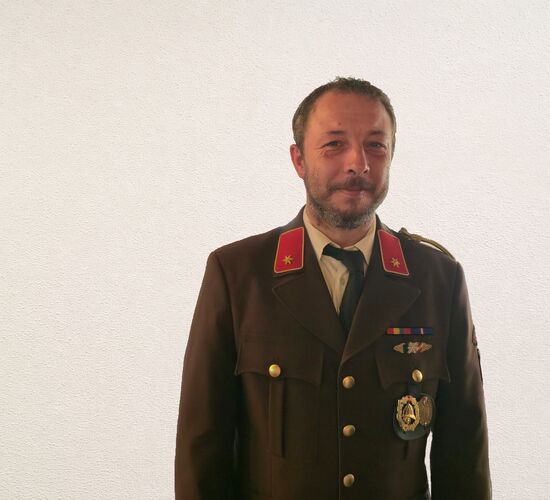 Portraitfoto in brauner Uniform mit Silberhelm